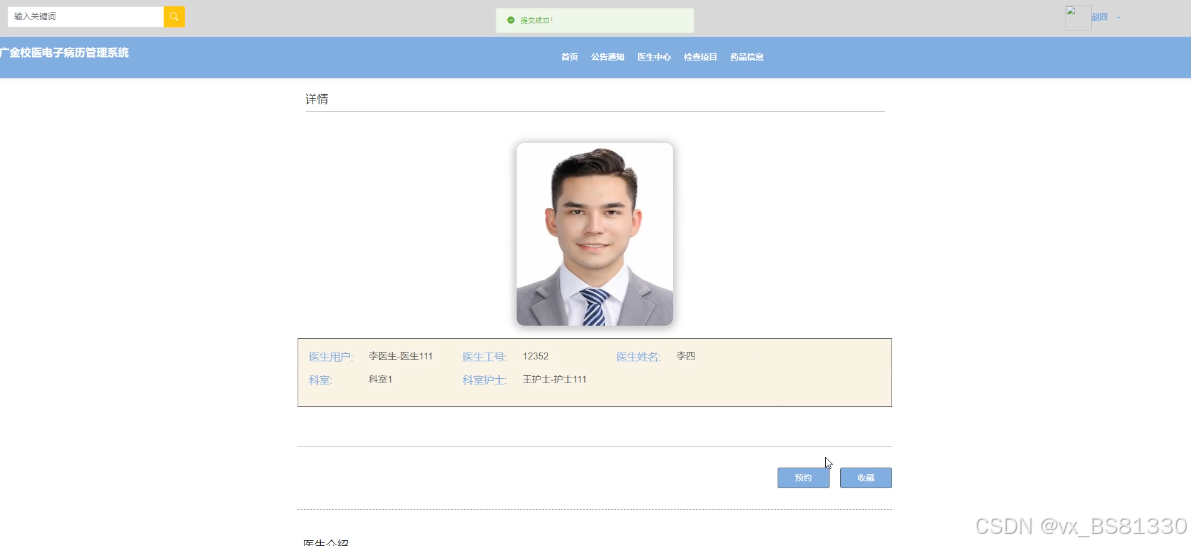 (4)医生中心:用户可以查看医生中心信息,在查询到自己想要了解的医生介绍信息的时候,可以进入查看详细的介绍,点击“预约”这一按钮以后会跳转到医生预约信息填写的界面,根据提示填写好医生预约的信息,点击“提交”以后医生预约就完成了,在医生中心详情这个界面,同时支持用户对喜欢的医生中心进行收藏以及评论的功能。