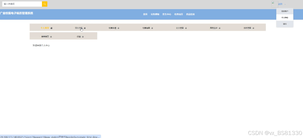(8)个人中心:用户点击右上角的“用户名”,然后点击“个人中心”可查看个人首页、预约信息、检查申请、检查结果、处方信息、用药监护、创伤信息、患者病历和自己收藏的信息并对其进行管理。