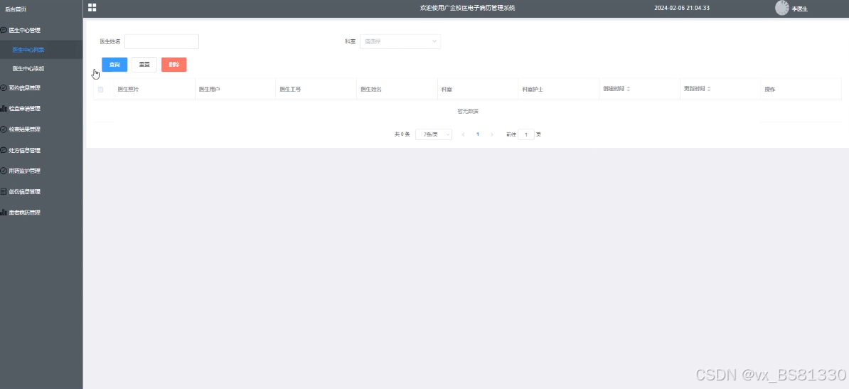 医生用户通过管理员添加的后台账号登录系统后台,可以对医生中心管理、预约信息管理、检查申请管理、检查结果管理、处方信息管理、用药监护管理、创伤信息管理、患者病历管理等模块进行管理。医生用户后台管理界面如下图4-10所示。