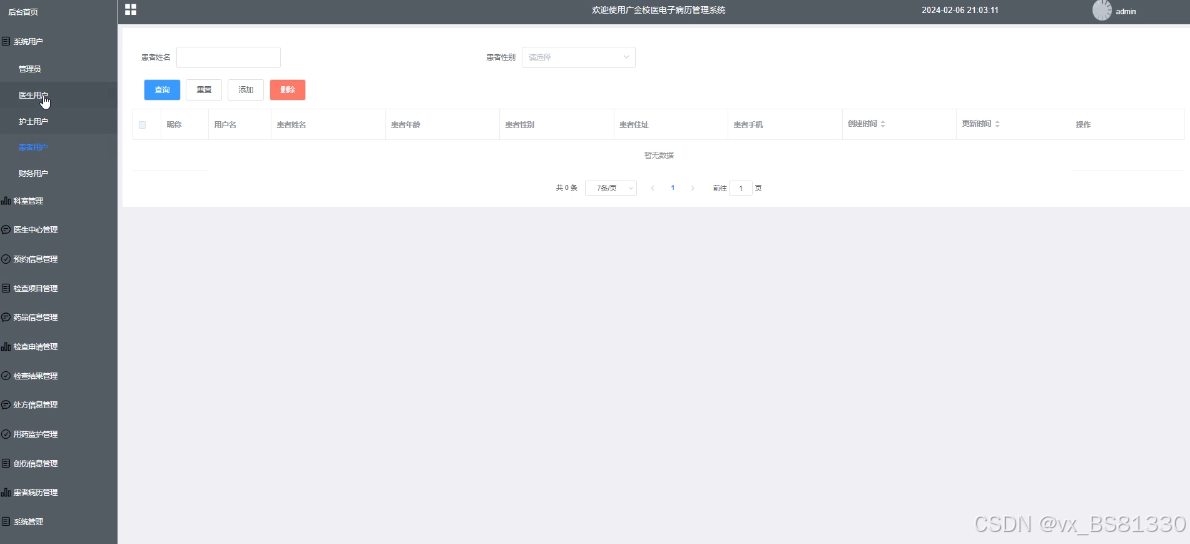 管理员管理模块:系统用户、科室管理、医生中心管理、预约信息管理、检查项目管理、药品信息管理、检查申请管理、检查结果管理、处方信息管理、用药监护管理、创伤信息管理、患者病历管理、系统管理、公告通知管理