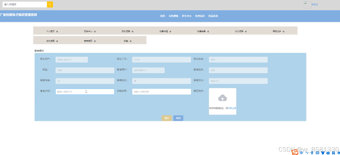 This design mainly implements a Guangjin School Medical Electronic Medical Record Management System that combines the advantages of humanization, high efficiency, and convenience. It completes system user, department management, doctor center management, appointment information management, examination project management, drug information management, examination application management, examination result management, prescription information management, medication monitoring management, trauma information management, patient medical record management, system management, etc Announcement notification management and other functional modules. The system communicates with the server through a browser to achieve data exchange and change. This system improves work efficiency and reduces errors and omissions in data storage through scientific management and convenient services. The Guangjin School Medical Electronic Medical Record Management System is developed using Java language and SpringBoot technology based on MVC mode. It is written using MyEclipse compiler and mainly uses Microsoft's MySQL relational database as the data storage medium. The system is developed in conjunction with front-end HTML+CSS technology.