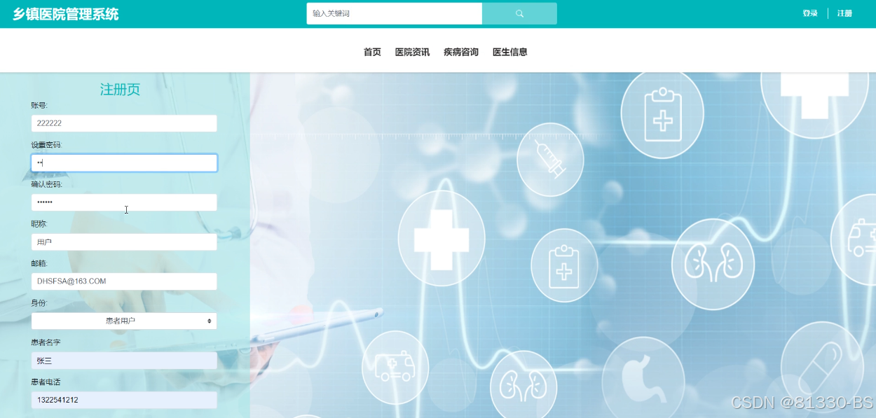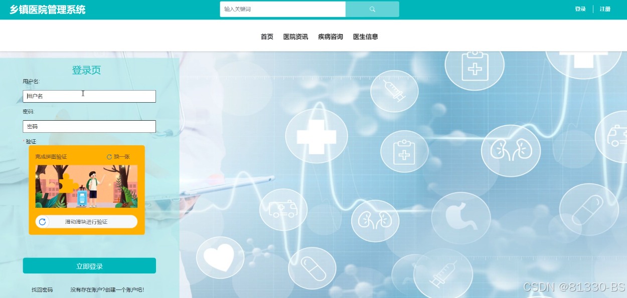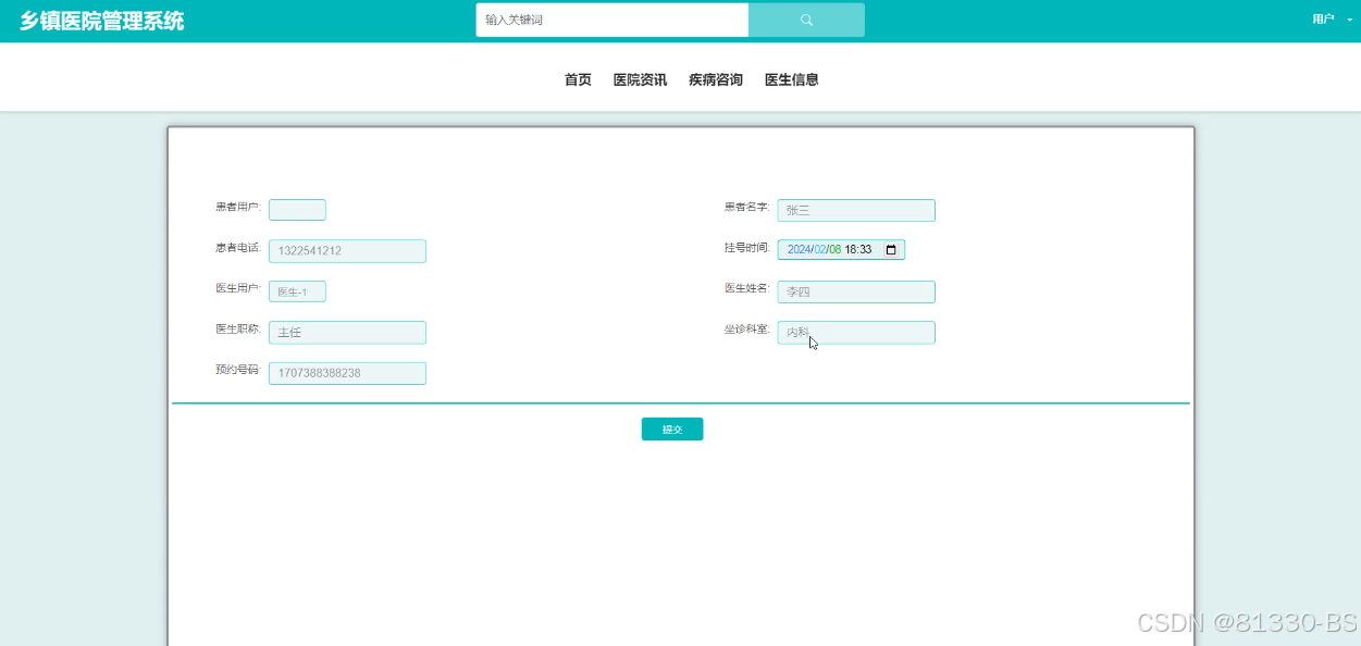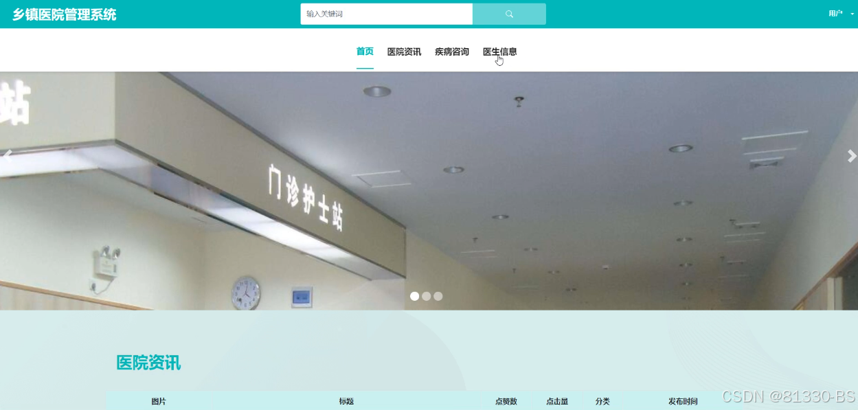 (2)查看乡镇医院管理系统的首页信息:乡镇医院管理系统的首页信息包含了首页、医院资讯、疾病咨询、医生信息等。