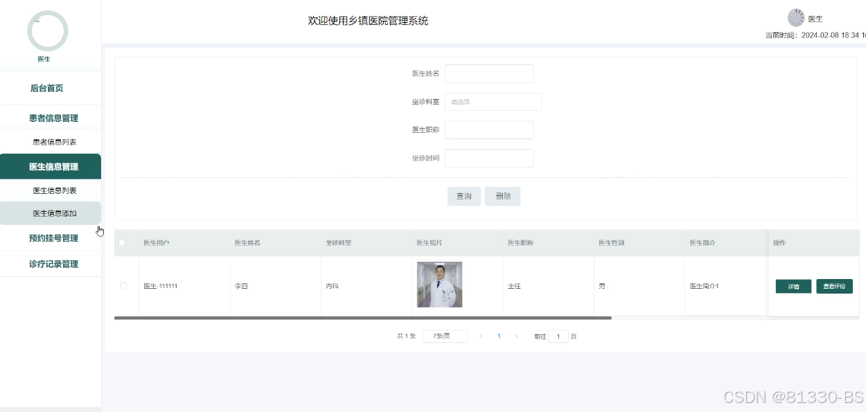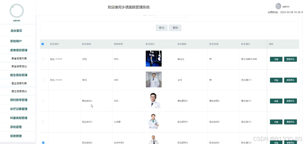 (4)医生信息管理:管理员点击“医生信息管理”会显示出所有的医生信息,支持输入科室名称或医生姓名对医生信息进行查询,如果想要添加新的医生信息,点击“添加”按钮,输入医生用户、医生姓名、坐诊科室、医生职称、医生性别、坐诊世家、挂号备注、医生简介等信息,点击“提交”按钮就可以添加了,同时可以选择某一条医生信息,点击“删除”进行删除,也可以对用户提交的医生评论的信息进行管控。