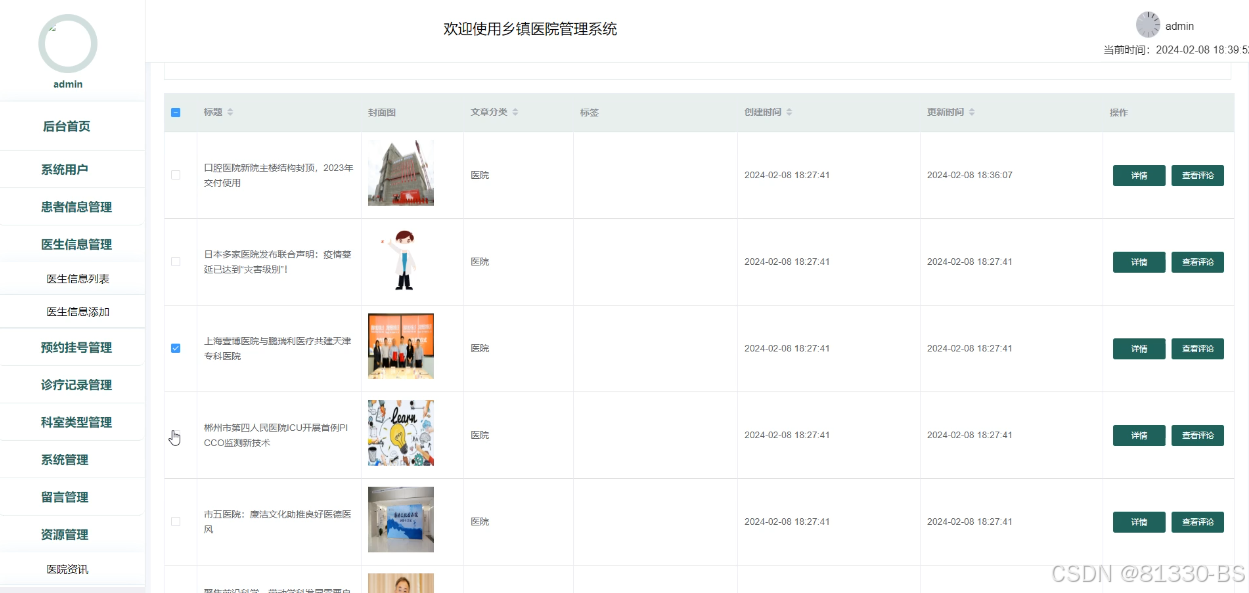(10)资源管理:管理员可以对乡镇医院管理系统前台展示的医院资讯以及医院资讯所属的分类进行管控。