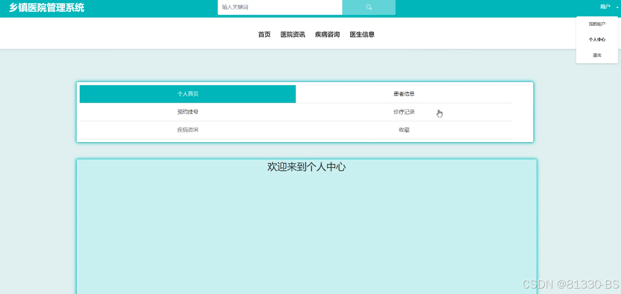 (7)个人中心:患者用户在前台点击“个人中心”可以对个人首页、患者信息、预约挂号。诊疗记录、疾病咨询和自己收藏的信息进行管理。