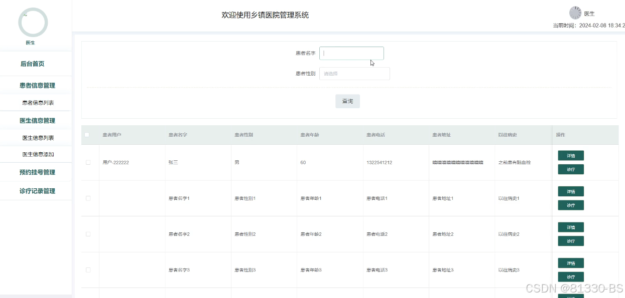 (2)患者信息管理:医生用户点击“患者信息管理”会显示所有患者用户的患者信息,点击详情可对患者信息进行诊断病症、诊疗方案等内容的添加。