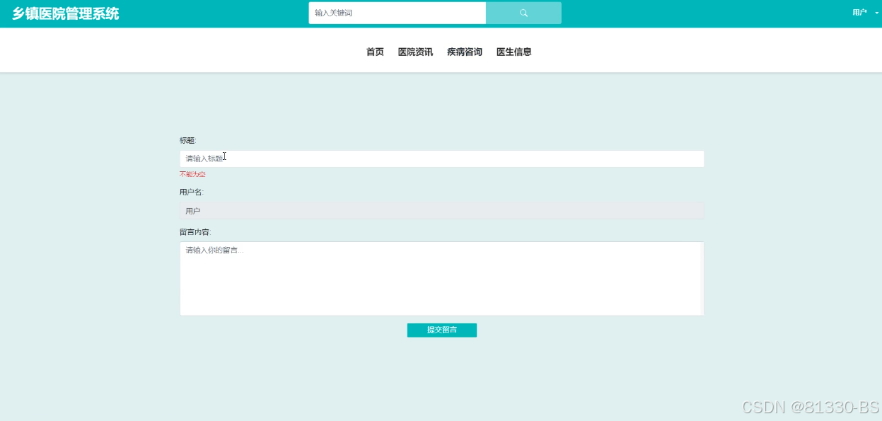 (4)疾病咨询:点击“疾病咨询”后跳转到疾病咨询填写界面,输入标题、用户名、留言内容,然后点击提交留言就完成了。