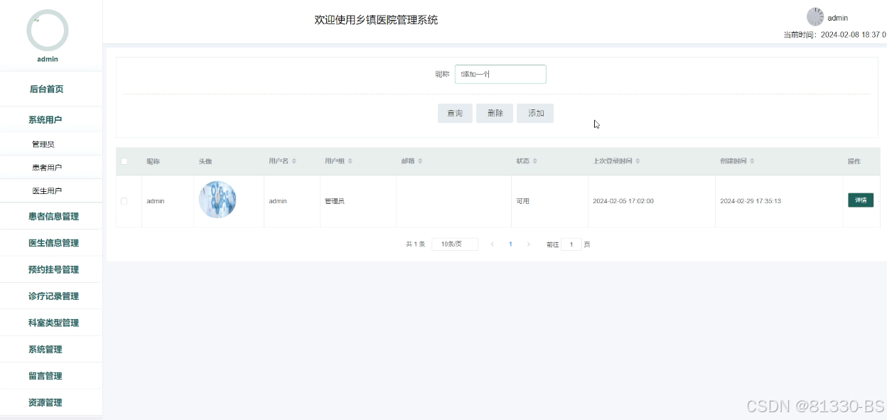 (2)系统用户:管理员可以对乡镇医院管理系统中的管理员,医生用户、以及前台注册的患者用户进行增删改查。