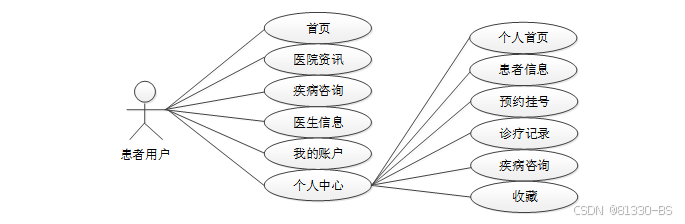 (1)用户注册登录:游客可以随时进入到系统中,对系统中的信息浏览,但是想要实现疾病咨询、预约挂号等操作,就必须有这个系统的账号,如果没有账号的话,可以注册患者用户进行相关的操作,同时用户还可以通过“我的”这一按钮对个人信息以及操作的信息进行管控。