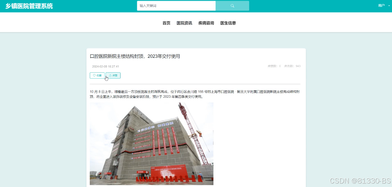(3)医院资讯:当用户点击“医院资讯”这一菜单按钮,会显示管理员在后台发布的所有的医院资讯,可以查看详情,进行收藏、点赞、评论等。