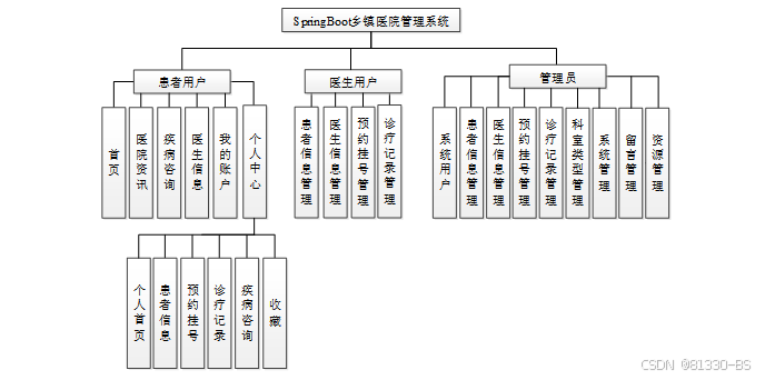 SpringBoot乡镇医院管理系统我划分为了患者用户模块,医生用户模块和管理员模块这三大部分。
