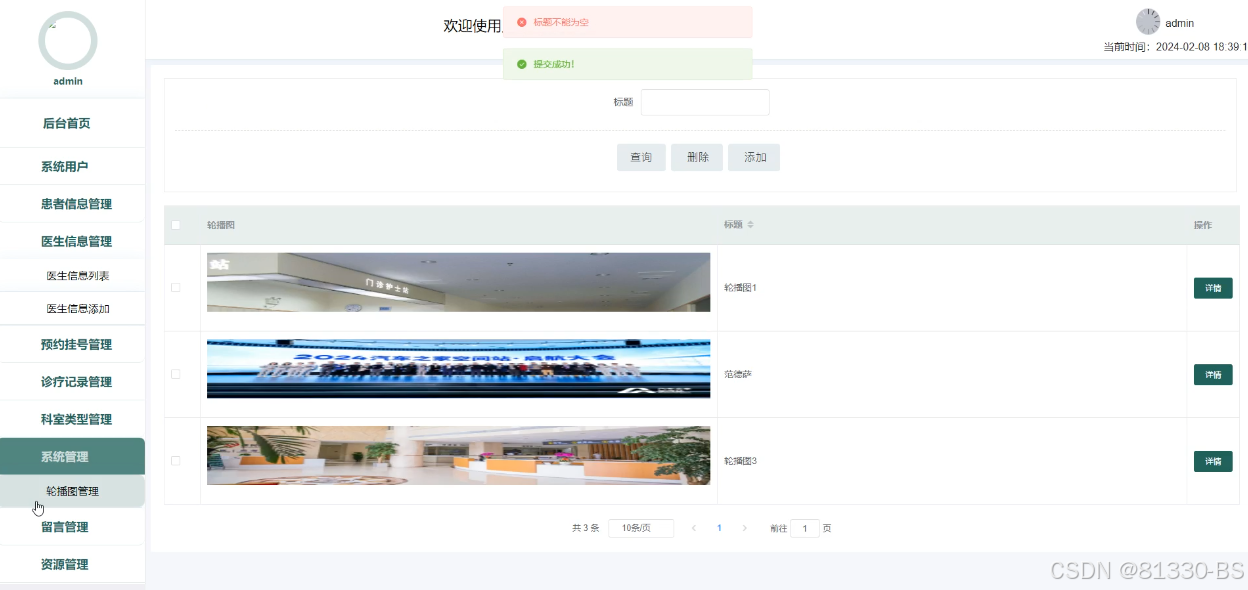 管理人员在“系统管理”这一菜单下是可以对乡镇医院管理系统内的轮播图进行添加修改的,其管理界面如下图4-14所示。