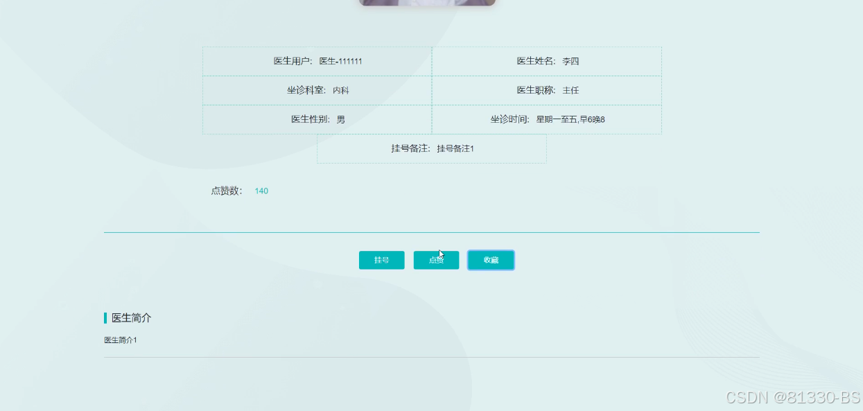 (5)医生信息:用户可以查看医生信息,在查询到自己想要了解的医生信息的时候,可以进入查看详细的介绍,包括医生用户、医生姓名、坐诊科室、医生职称、医生性别、坐诊世家、挂号备注、医生简介等信息,点击“挂号”这一按钮以后会跳转到预约挂号填写的界面,根据提示填写好挂号信息,点击“提交”以后就完成了;在医生信息详情这个界面,同时支持用户对喜欢的医生信息进行收藏、点赞以及评论的功能。