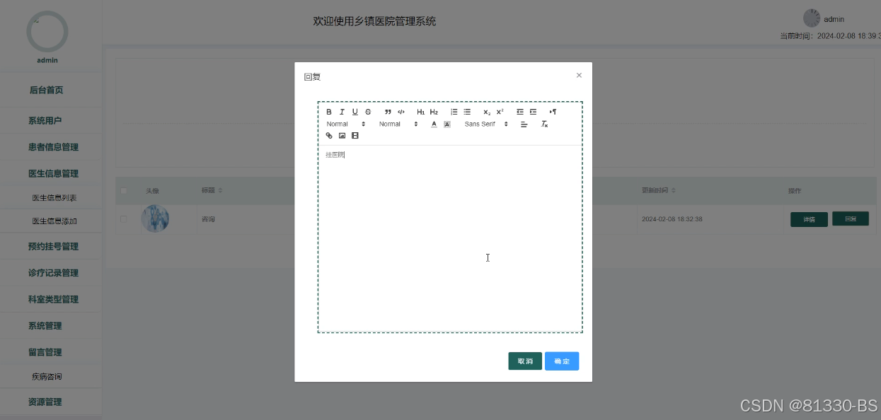管理员点击“留言管理”菜单能够对用户在前台提交的疾病咨询内容进行回复。留言回复界面如下图4-16所示。
