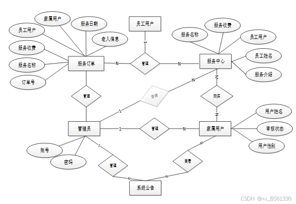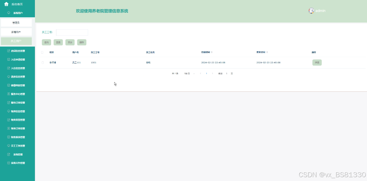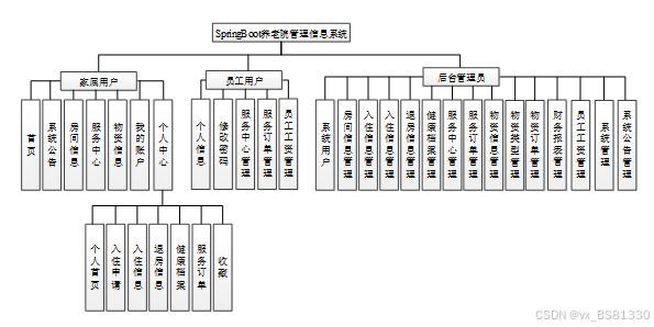 养老院管理信息系统的功能主要分为家属用户、员工用户和后台管理员一共三个角色,其中员工用户账号由管理员后台添加登录。