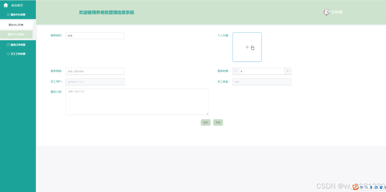 员工用户账号密码由管理员在后台添加,登录进入系统之后可以对个人信息和密码进行修改,其管理模块主要对服务中心管理、服务订单管理、员工工资管理进行管理。员工用户可以在服务中心添加自己的服务信息,当家属用户购买服务之后,对服务订单进行审核回复;也可以查看管理员添加的员工工资信息详情。员工用户后台管理界面如下图所示。