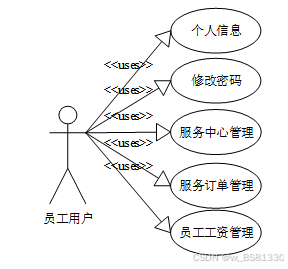 员工用户账号密码由管理员在后台添加,登录进入系统之后可以对个人信息和密码进行修改,其管理模块主要对服务中心管理、服务订单管理、员工工资管理进行管理。员工用户可以在服务中心添加自己的服务信息,当家属用户购买服务之后,对服务订单进行审核回复;也可以查看管理员添加的员工工资信息详情。员工用户用例图如下所示。