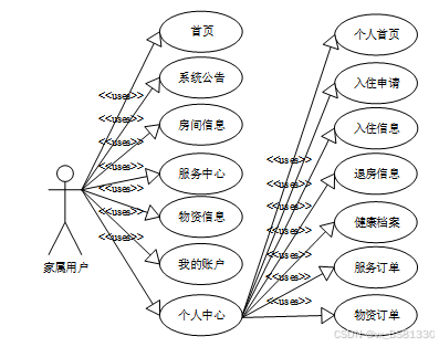 前台的主要功能模块有首页、系统公告、房间信息、服务中心、物资信息、我的账户、个人中心。家属用户登录系统后不仅可以查看系统公告消息,浏览房间信息 ,按偏好和需求可以对房间信息申请入住,还可以查看服务中心的服务信息并购买服务;同样在物资信息页面可以购买物资物品。在个人中心界面还可以对个人首页、入住申请、入住信息、退房信息、健康档案、服务订单、物资订单等信息进行修改管理。家属用户用例图如下所示。