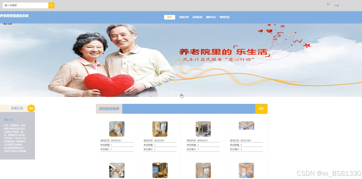 在系统前台中主要实现的是对养老院管理信息系统中信息的浏览、评论,家属用户主要对房间信息、物资信息和服务中心等信息的申请入住、购买物资和服务功能。