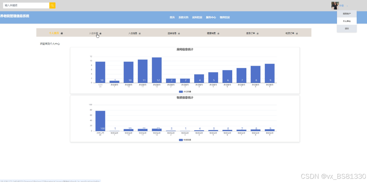 家属用户点击右上角“个人中心”模块,可以查看和管理个人相关的信息和任务,包括个人首页、入住申请、入住信息、退房信息、健康档案、服务订单、物资订单功能模块。
