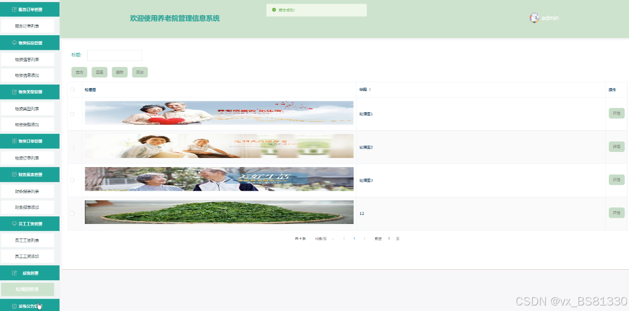 管理员点击“公共管理”菜单可以对系统的轮播图进行管理,查看到系统中的所有轮播图信息,对已经存在的轮播图,管理员可以修改,也可以发布新的轮播图信息。轮播图管理界面如下所示。