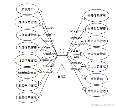 管理员的后台管理模块主要是对前台的注册家属用户和后台的员工用户及管理员进行账户信息管理,同时对系统的房间信息管理、入住申请管理、入住信息管理、退房信息管理、健康档案管理、服务中心管理、服务订单管理、物资信息管理、物资类型管理、物资订单管理、财务报表管理、员工工资管理、系统管理、系统公告管理等信息进行管理。管理员用例图如下所示。