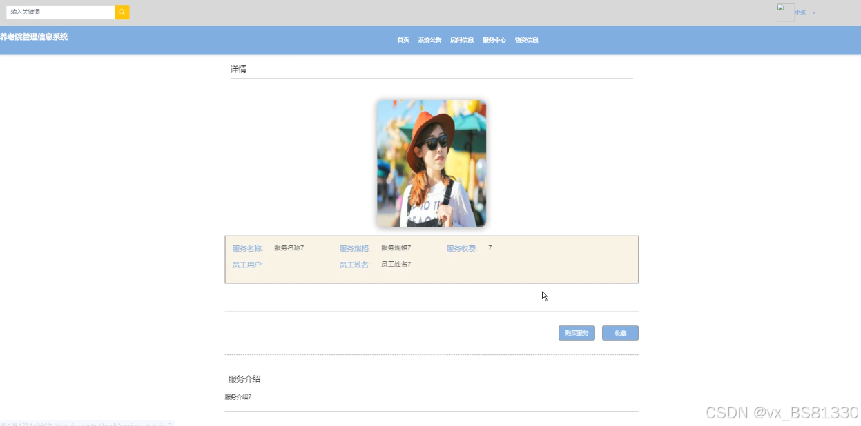 当前台家属用户点击养老院管理信息系统中导航栏上的“服务中心”后将会进入到“服务中心”列表的界面,然后选择想要查看的服务项目信息,点击进入到详细界面,在详细界面可以查看服务名称、服务规格、服务收费、员工用户、员工姓名、服务介绍等信息,家属用户可以进行购买服务和收藏等操作,服务中心信息详情界面如下图所示。