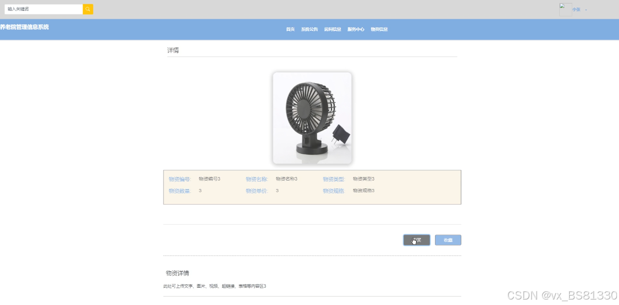 当前台家属用户点击养老院管理信息系统中导航栏上的“物资信息”后将会进入到“物资信息”列表的界面,然后选择想要查看的物资信息,点击进入到详细界面,在详细界面可以查看包括物资编号、物资名称、物资类型、物资数量、物资单价、物资规格、物资详情等信息,家属用户可以进行购买和收藏等操作,物资信息详情界面如下图所示。