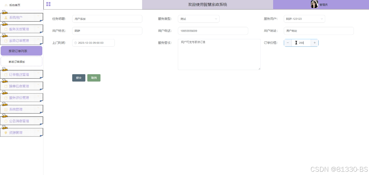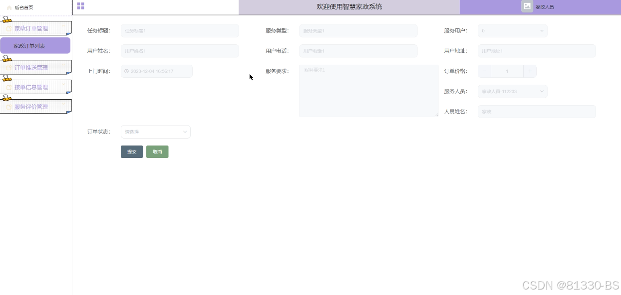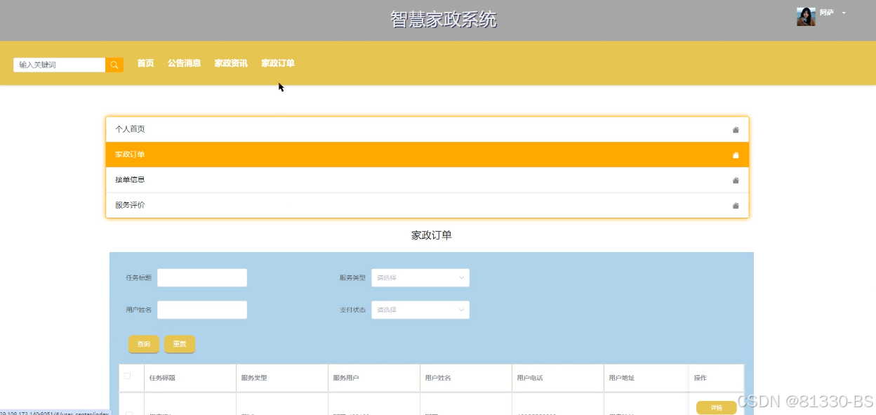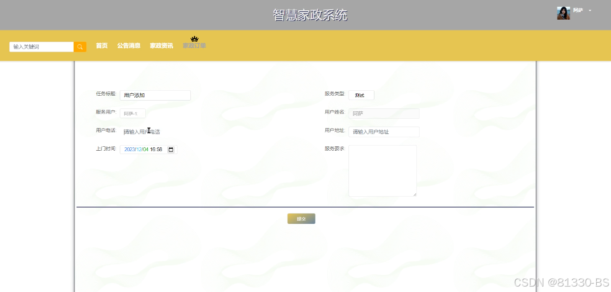 (5)家政订单:用户点击导航栏的“家政订单”按钮进入到家政订单发布页面,用户可通过填写任务标题、服务类型、服务用户、用户姓名、用户电话、用户地址、上门时间、服务要求等信息提交家政订单信息。