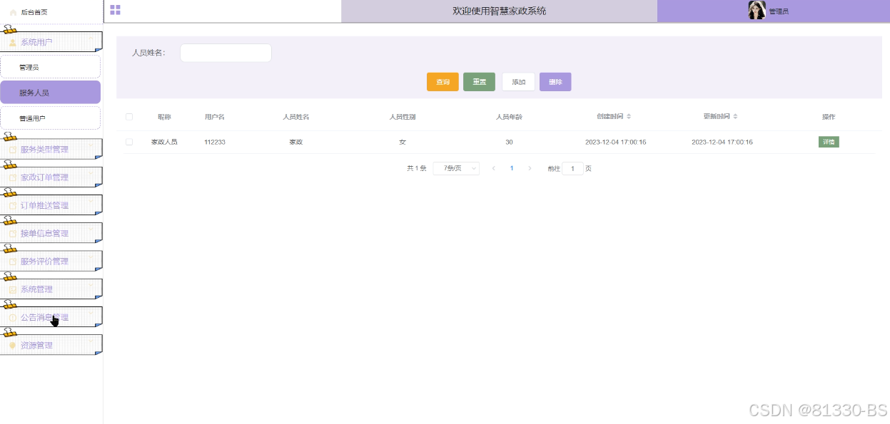 (2)系统用户:管理员可以对智慧家政系统中的管理员、普通用户、服务人员进行增删改查。