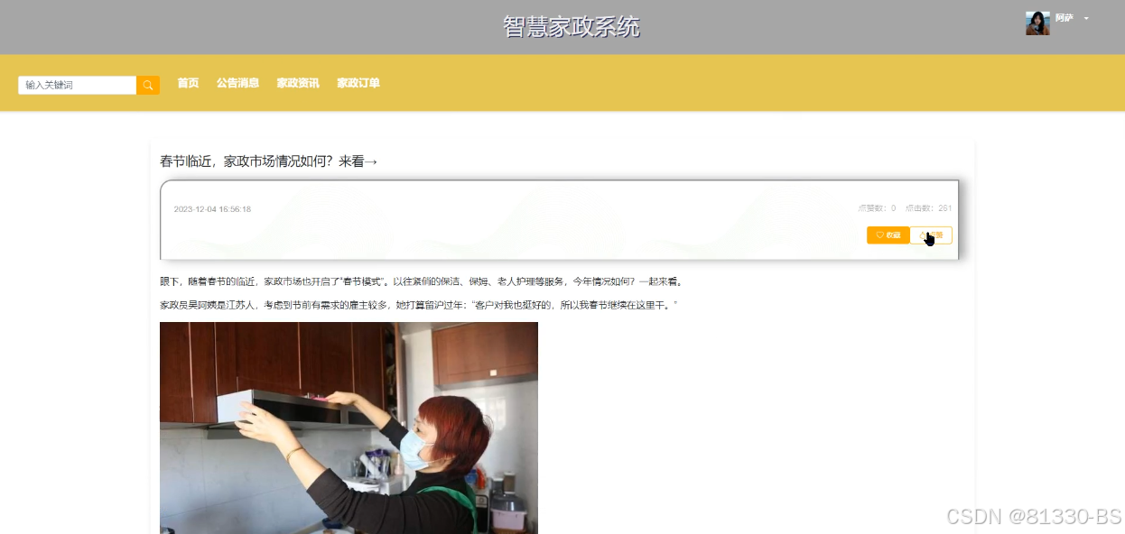 (4)家政资讯:在前台点击“家政资讯”按钮进入家政资讯列表,可以输入关键词进行查询家政资讯信息,并且可以对查看的家政资讯进行评论、收藏、点赞操作。