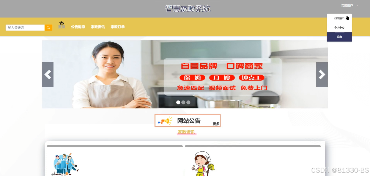 (2)查看智慧家政系统的首页信息:智慧家政系统的首页信息包含了首页、公告消息、家政资讯、家政订单、我的账户、个人中心等。