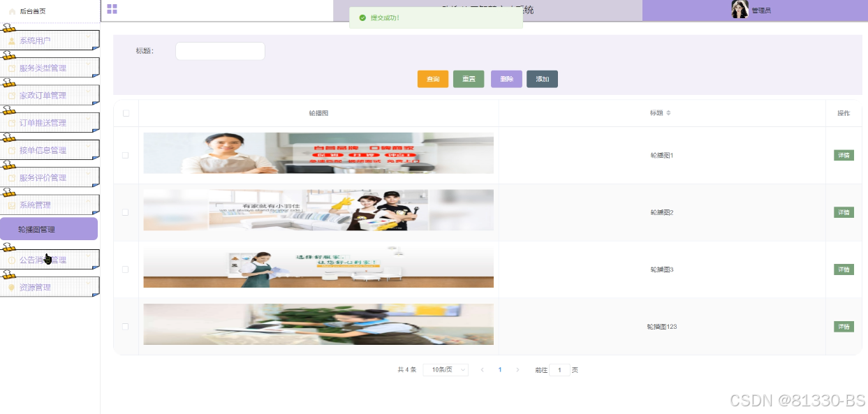 智慧家政系统中的管理人员在“系统管理”这一菜单下是可以对智慧家政系统内的轮播图进行添加修改的,其管理界面如下图所示。