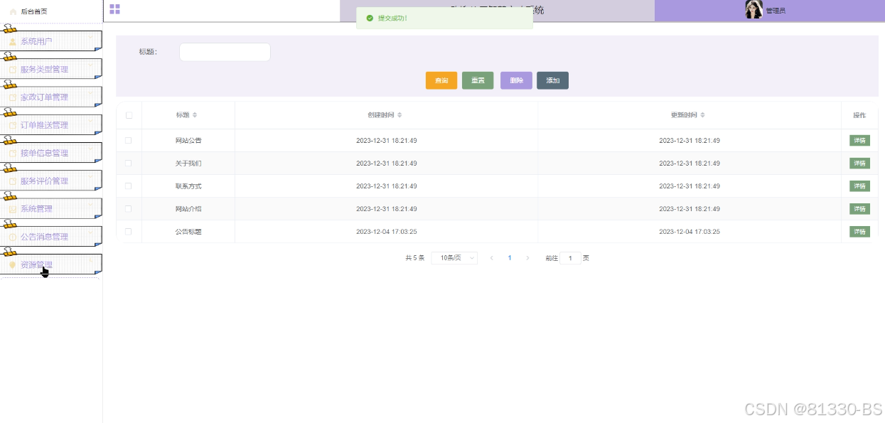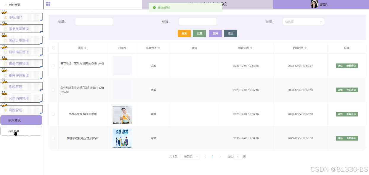 管理员点击“资源管理”菜单能够对其下子菜单家政资讯和家政资讯的分类进行增删改查。资源管理界面如下图所示。