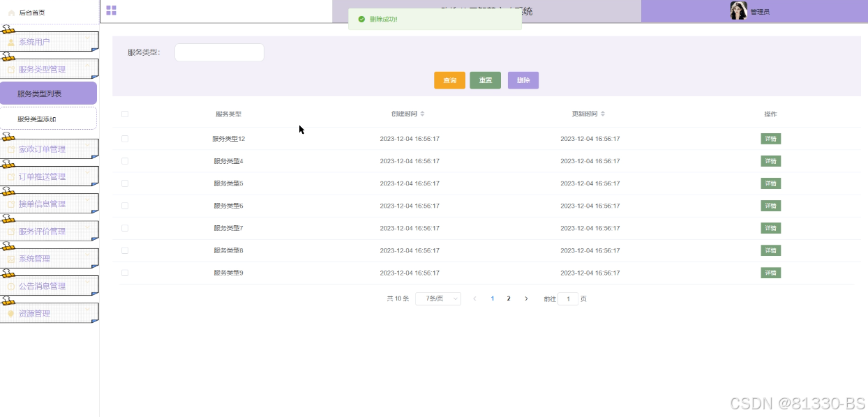 (3)服务类型管理:管理员点击“服务类型管理”菜单可以对平台的服务类型进行增删改查。
