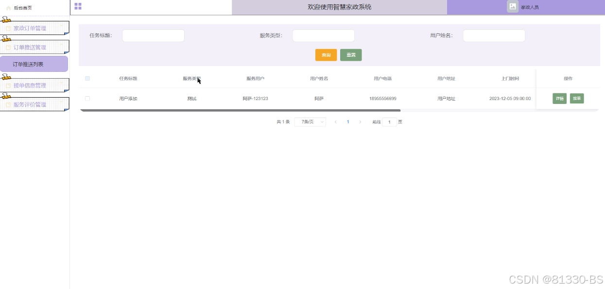(3)订单推送管理:服务人员在后台点击“订单推松管理”按钮的时候就会显示出自己所接收到的管理员推送的家政订单信息,支持对订单信息的搜索查询和接单操作。