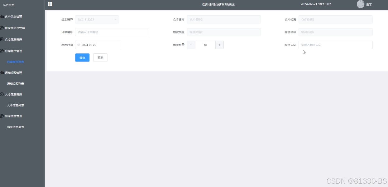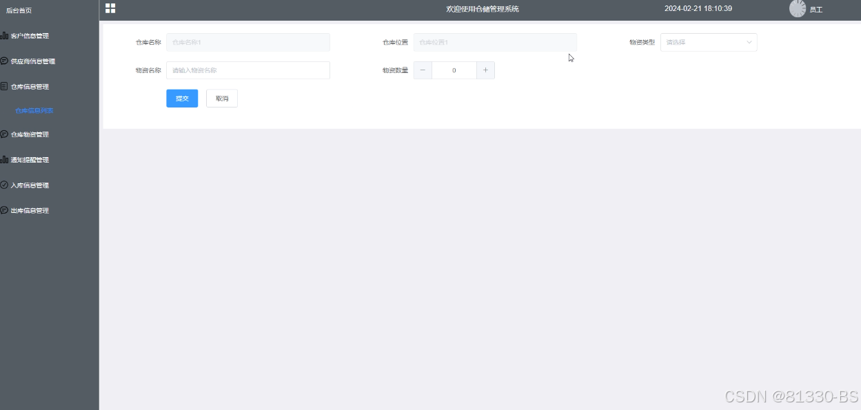 仓库物资管理:管理员和员工都可以对物资进行管理,包括添加物资、编辑物资信息、删除物资等操作。管理员需要对物资的基本信息进行维护,如仓库名称、仓库位置、物资类型、物资名称、物资数量等,以便于后续的库存管理和查询。员工添加仓库物资界面如下图所示。