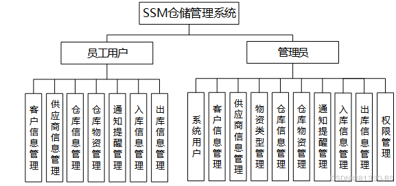 系统功能模块包括管理员模块和员工用户模块,登录进去对应相应的功能,具体的功能模块图如图3.1所示。