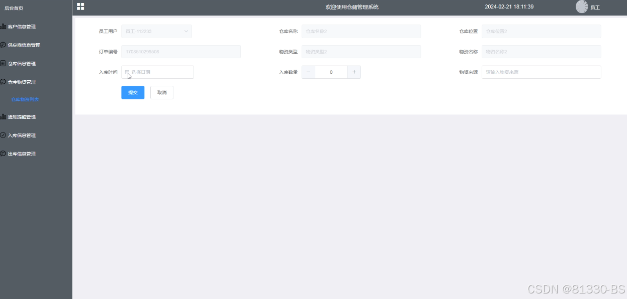 入库信息管理:员工用户可以记录物资的进货信息,包括员工用户、仓库名称、仓库位置、订单编号、物资类型、物资名称、入库时间、入库数量、物资来源等。他们负责将进货信息录入系统,并确保信息的准确性和完整性,以便后续的库存管理和成本控制。界面如下图所示。