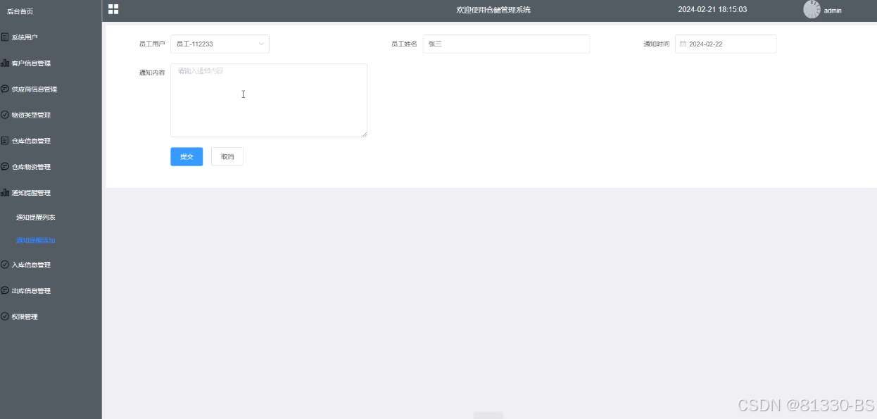 通知提醒:管理员对通知提醒信息进行增删改查操作。员工用户可以查看管理员发送的通知提醒信息,以及与工作相关的重要信息。管理员添加通知提醒界面如下图所示。