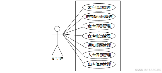 (5)仓库物资管理:员工用户可以查询和浏览物资信息,包括仓库名称、仓库位置、物资类型、物资名称、物资数量等。他们可以根据需要查询特定物资的信息,并进行必要的操作,如出入库、修改物资详情等。