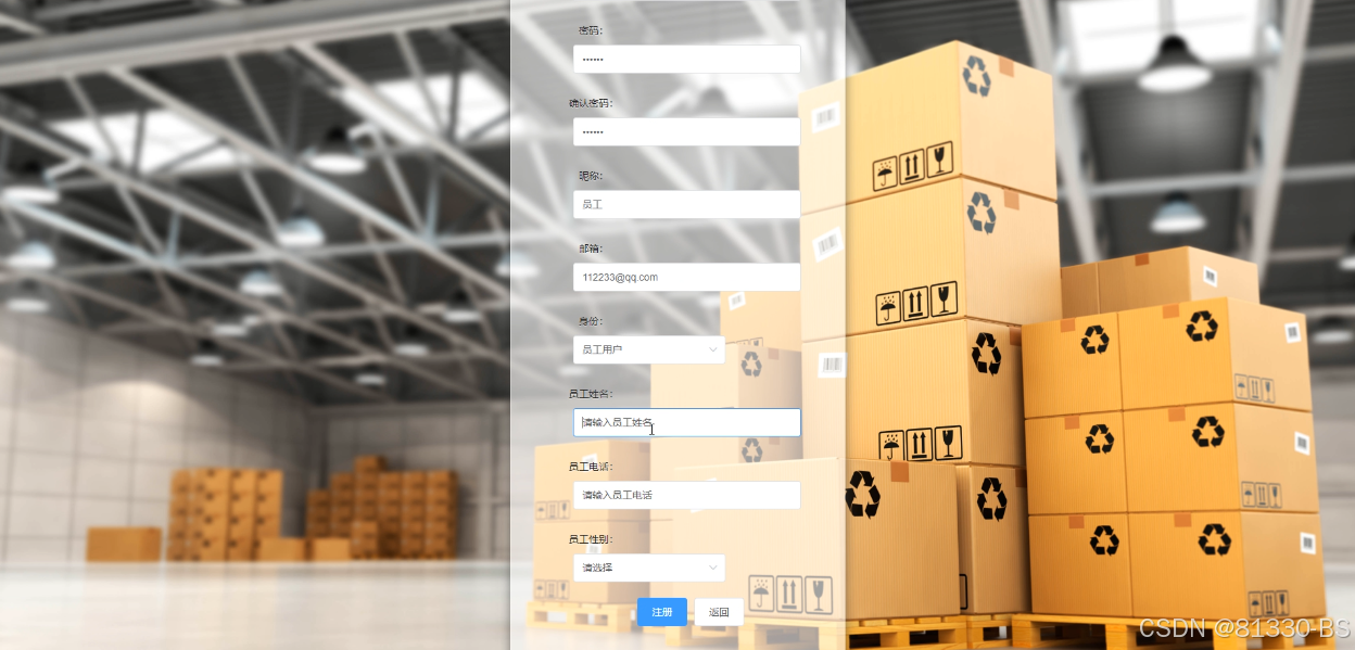仓储管理系统的员工用户是可以进行注册登录,当用户点击右上角“注册”按钮的时候,当填写上自己的账号+密码+确认密码+昵称+邮箱+手机号等后再点击“注册”按钮后将会先验证输入的有没有空数据,再次验证密码和确认密码是否是一样的,最后验证输入的账户名和数据库表中已经注册的账户名是否重复,只有都验证没问题后即可用户注册成功。其用户注册界面展示如下图4.2所示。