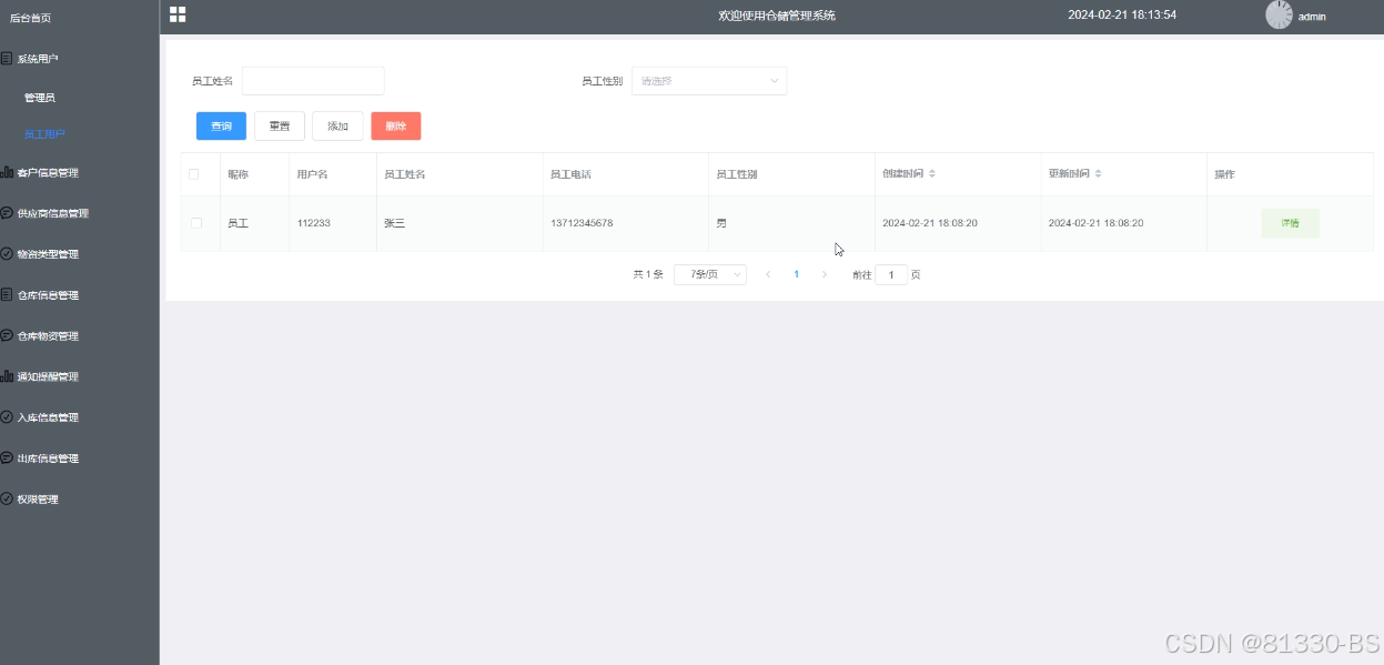 系统用户管理:管理员负责管理系统的用户,包括管理员和员工用户的登录、权限分配等操作。他们可以添加、编辑或删除用户账户,并设定相应的权限。界面如下图所示。
