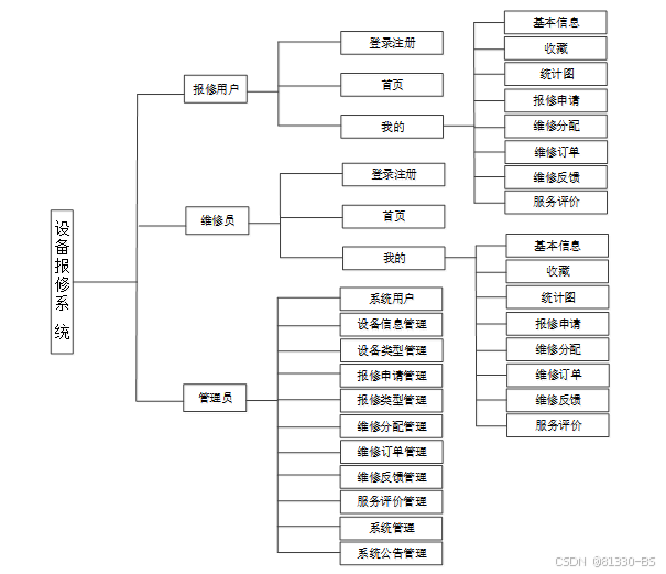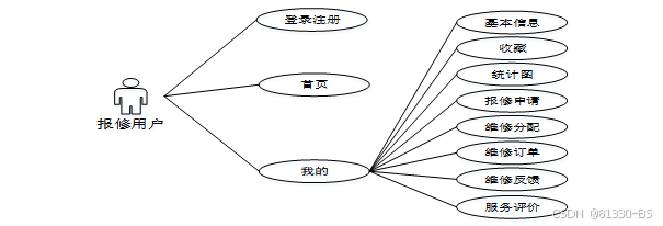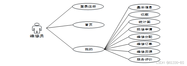 维修员角色的用例包括首页、设备信息、我的(基本信息、收藏、统计图、报修申请、维修分配、维修订单、维修反馈、服务评价)。报修用户用例图如下所示。维修员用例图如下所示。