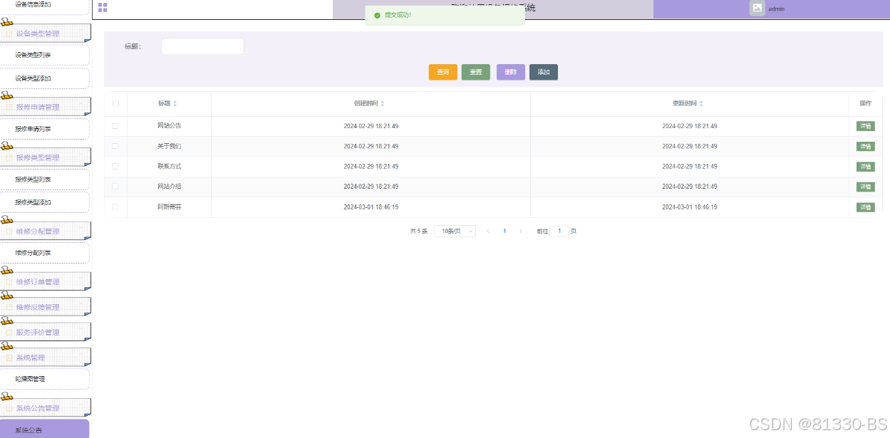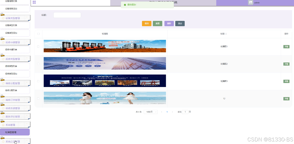 设备报修系统中的管理人员在“系统管理”这一菜单下是可以对设备报修系统内的轮播图进行添加修改的,其管理界面如下图所示。