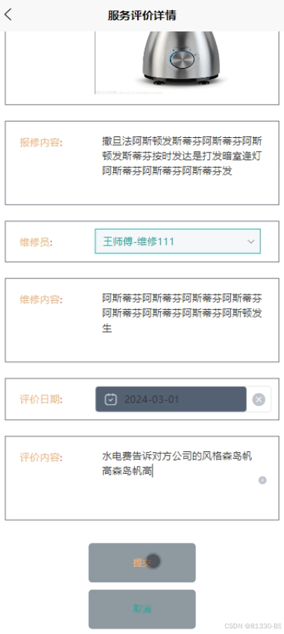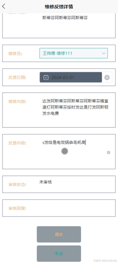 维修员确认维修订单后,报修用户填写维修反馈信息。填写维修反馈信息单界面如图所示。