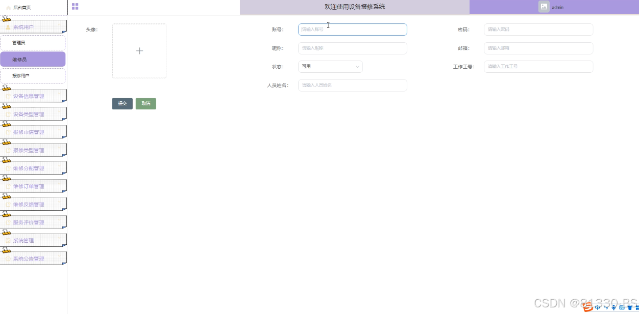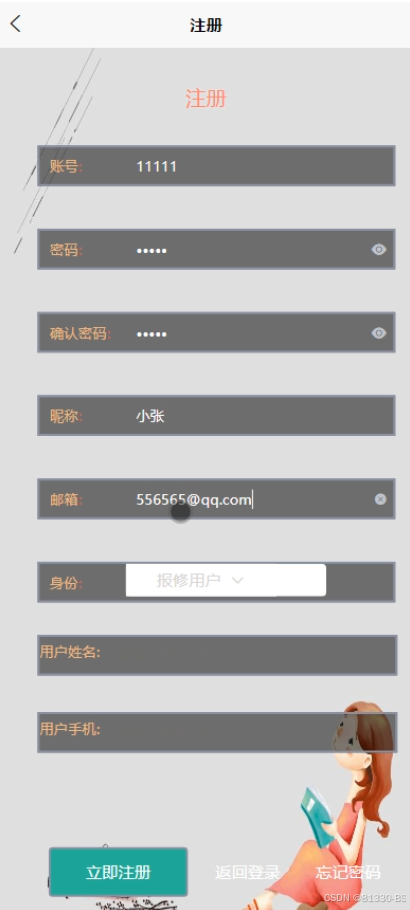 用户通过注册了方可获得登录使用权限,此时选择注册用户选项,系统就会自动转到用户注册工作面,在注册该部分信息时系统会自动调用add函数,然后在给定的文本框中填写有关该用户的基础信息后选择确认即可完成注册。检索用户信息,在新增用户信息以后,在检索工具栏中填写对应的用户信息,系统就会将该用户有关的所有信息展示出来。本系统的报修用户可在前台自行注册登录,维修员则是由管理员在后台添加账号。