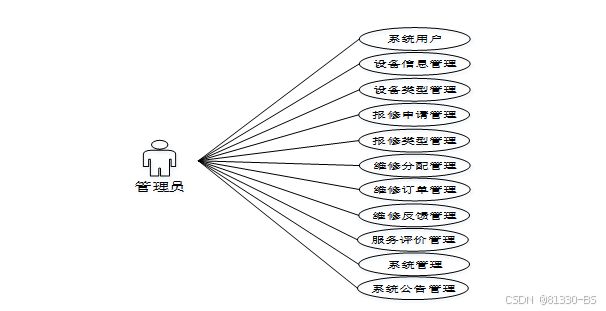 管理员角色的用例包括系统用户、设备信息管理、设备类型管理、报修申请管理、报修类型管理、维修分配管理、维修订单管理、维修反馈管理、服务评价管理、系统管理、系统公告管理。管理员用例图如下所示。