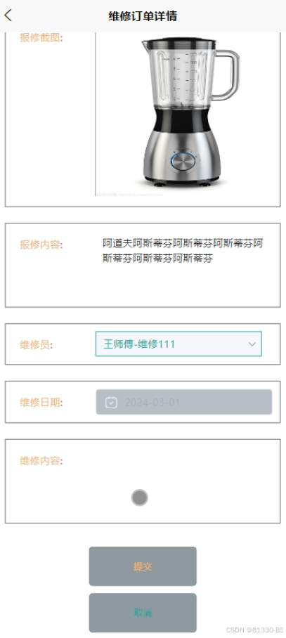 提交报修申请后,需要由管理员或维修员确认维修订单。维修员确认订单界面如图所示。