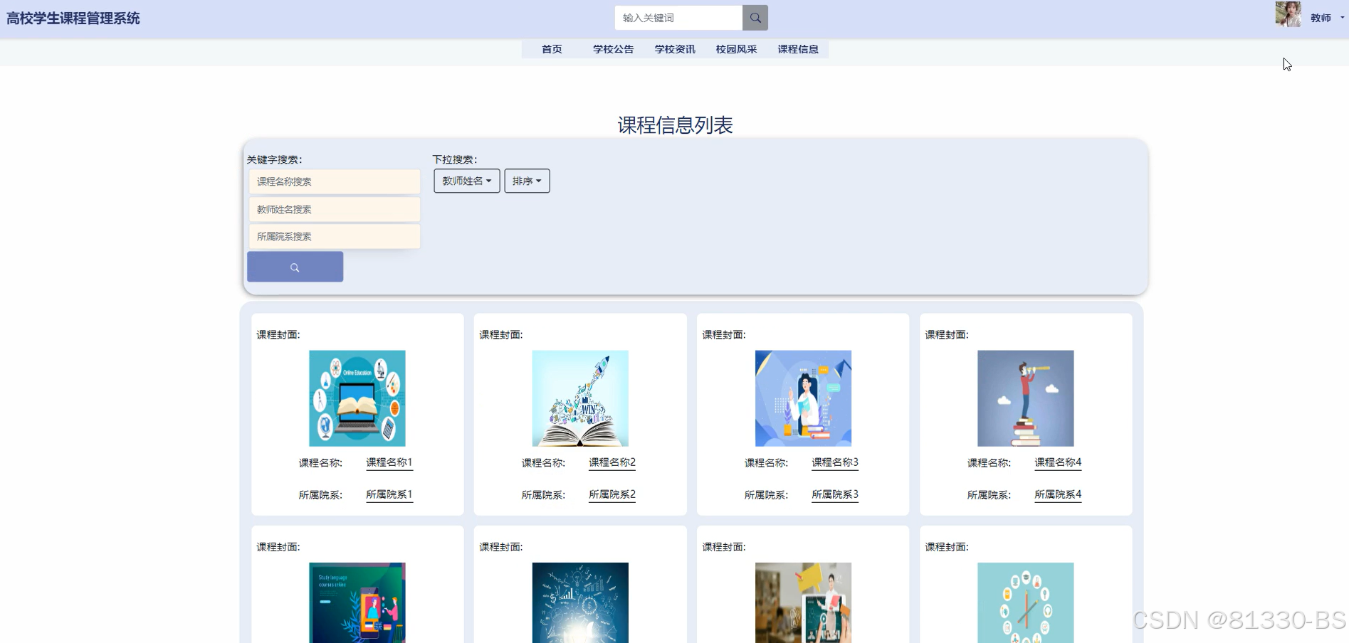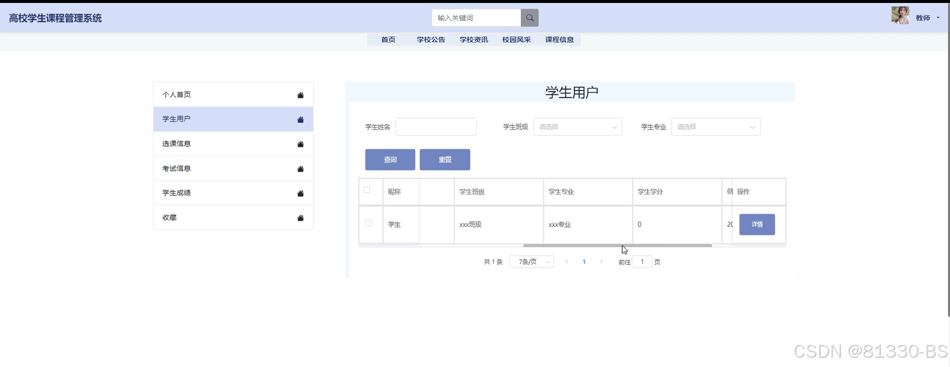 教师用户模块功能有:我的账户、个人中心(个人首页、学生用户、选课信息、考试信息、学生成绩、收藏)、首页、学校公告、学校资讯、校园风采、课程信息。